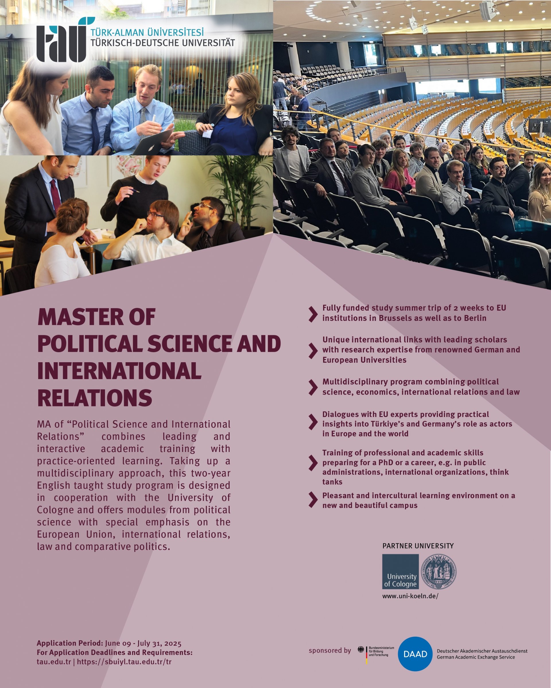 İngilizce dilinde eğitim veren Siyaset Bilimi ve Uluslararası İlişkiler Yüksek Lisans Programı, öğrencilere iki yıllık eşsiz bir eğitim imkanı sunmaktadır. Öğrencilere disiplinler arası bir bakış açısını kazandırmak amacıyla Siyaset Bilimi ve Uluslararası İlişkiler alanı; siyasi, ekonomik, hukuki ve tarihi boyutlar göz önünde bulundurularak incelenecektir. Bölüm bünyesinde bulunan uluslararası akademisyenler öğrencilerin kültürlerarası bir bakış açısına sahip olmalarına yardımcı olacaktır. Önerilen Yüksek Lisans programı, Siyaset Bilimi, Uluslararası İlişkiler, Avrupa Çalışmaları ve Hukuk bilim dallarının katkılarından oluşmaktadır. Bu nedenle program disiplinlerarası ve araştırma yönelimlidir. Programın öne çıkan özelliklerinden bir diğeri Brüksel ve Berlin’e düzenlenen iki haftalık akademik gezidir. Tüm masrafları program tarafından karşılanan bu gezide öğrenciler, Avrupa Birliğinin önde gelen kurumları, düşünce kuruluşları ve siyasi aktörlerle doğrudan temas kurma fırsatına sahip olacaklardır. Akademik niteliği ve uluslararası yönüyle donanımlı bir lisansüstü eğitim sunan program, Siyaset Bilimi ve Uluslararası İlişkiler alanında derinleşmek isteyen adaylara önemli bir fırsat sunmaktadır.